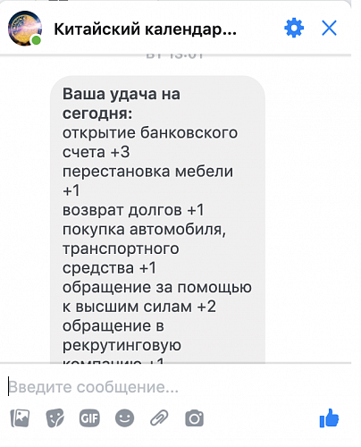 Бесплатно подключите нашего бота https://m.me/GoodLuckCalendarBot к вашему мессенджеру Фейсбук и он каждое утро будет присылать вам список благоприятных дел: чтобы вы смогли спланировать день....